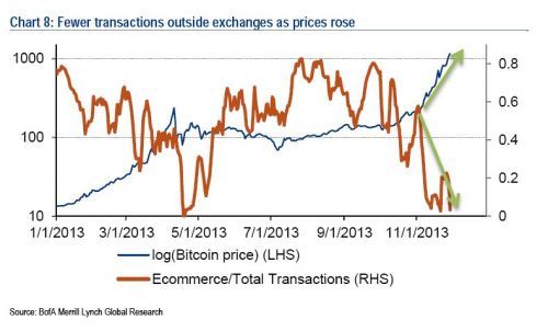 显然,市场对比特币公平价格的理解还严重依赖未来可能出现的非常规货币政策。如果联储(FederalReserve)的定量宽松(quantitativeeasing)明年仍旧继续下去的话,也就是如大家普遍预期的那样,对于“安全港(safehaven)”资产(比如黄金或比特币)的需求会增加,进而支持它们的价值。我们预计联储政策放松始于明年一季度,同时美元将会慢慢重新获得其全球储备货币的公信力,特别是美国在不断地减少财政赤字,明年可能会降至GDP 的 4% 以下。比特币作为一种储值工具来说,可能要在挣扎中获得发展动力,特别是在我们对于美元 2014年的牛市展望成为现实的情况下。
